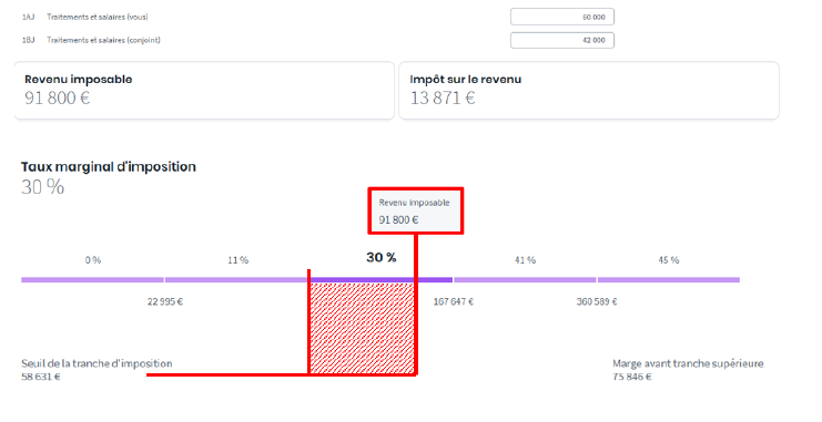 Tous deux âgés de 45 ans, ils prendront leurs retraites dans 20 ans. Leurs enfants n’étant plus à charge, compte-tenu de leurs revenus d’activités respectifs (3 500 €/mois nets imposables pour Madame, 5 000 €/mois nets imposables pour Monsieur), près de 33 000 € de leurs revenus imposables le sont au taux de 30 % :