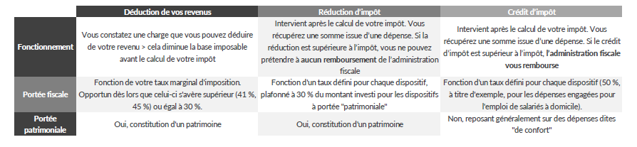 A privilégier si vous avez atteint le plafond des réductions et crédits d’impôt (10 000 €) et/ou si vous avez un taux d’imposition élevé : le gain étant proportionnel au taux d’imposition (0 %, 11 %, 30 %, 41 % ou 45 %).
